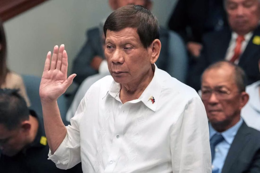 FILE - Former Philippine President Rodrigo Duterte takes oath during a senate inquiry on the so-called war on drugs during his administration at the Philippine Senate, on Oct. 28, 2024, in Manila, Philippines. (AP Photo/Aaron Favila,File)